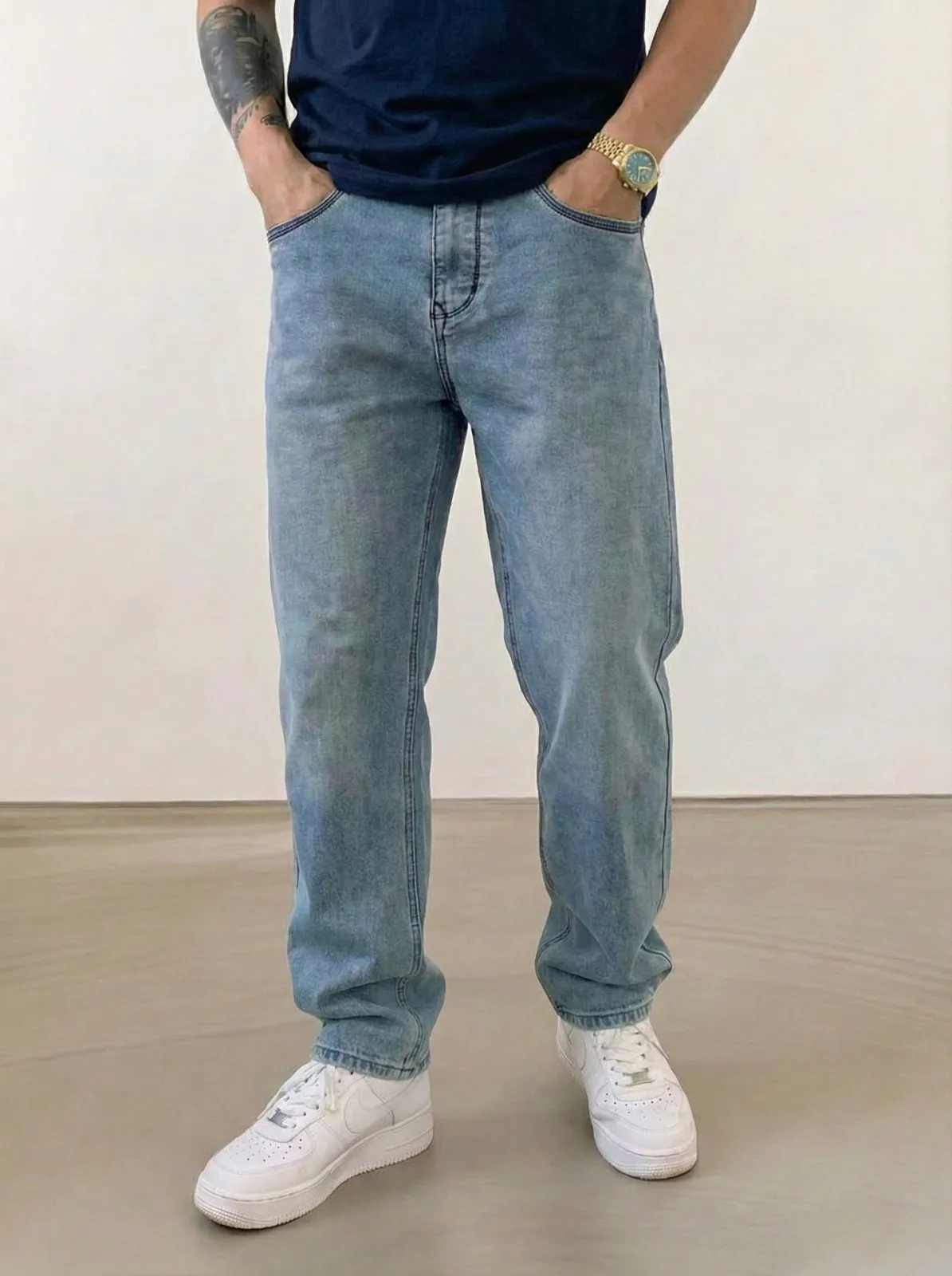 بنطلون جينز بتصميم عصري يجمع بين الراحة والأناقة. يتميز بلون فاتح ممسوح (Acid Wash) وقصة مستقيمة تناسب إطلالاتك اليومية. مصنوع من قماش عالي الجودة ليدوم طويلاً.