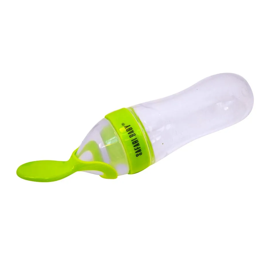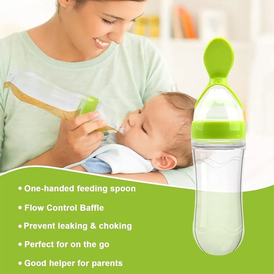 زجاجة رضاعة مبتكرة مصنوعة من السيليكون الآمن، مزودة بملعقة ناعمة في النهاية. مصممة لتقديم الأطعمة المهروسة، وحبوب الأرز، وشبه السائلة للرضع والأطفال الصغار بطريقة سهلة ومتحكم بها.