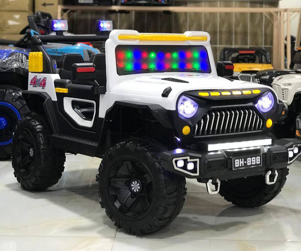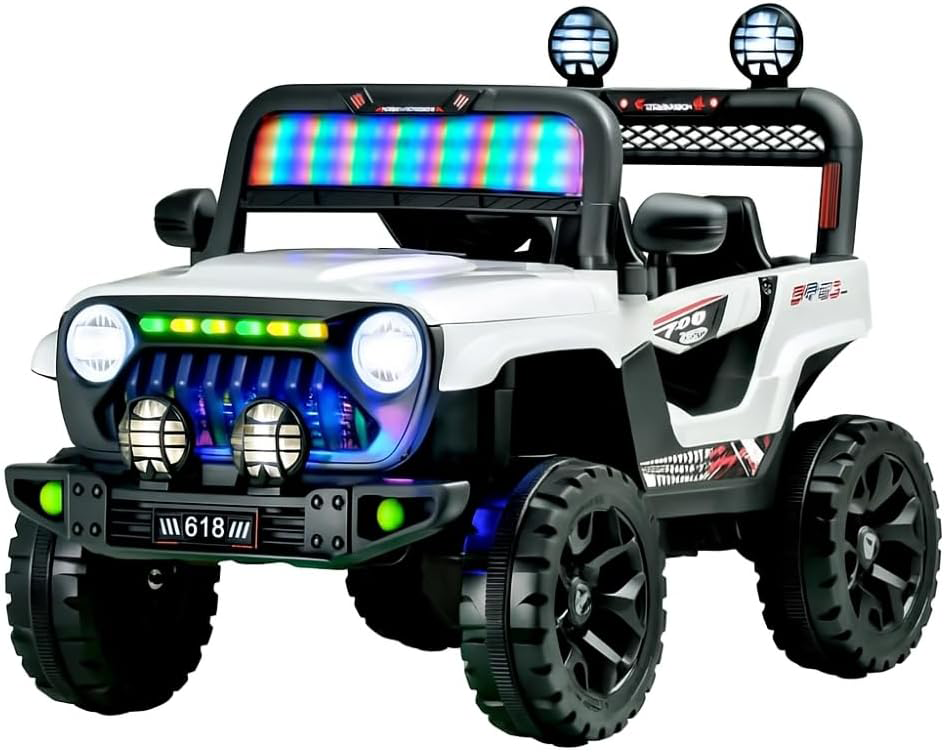 سيارة جيب كهربائية للركوب للأطفال، لون أبيض مع أضواء ليد، نمط الطرق الوعرة، سيارة تعمل بالبطارية 12 فولت مع شريط إضاءة وجهاز تحكم عن بعد