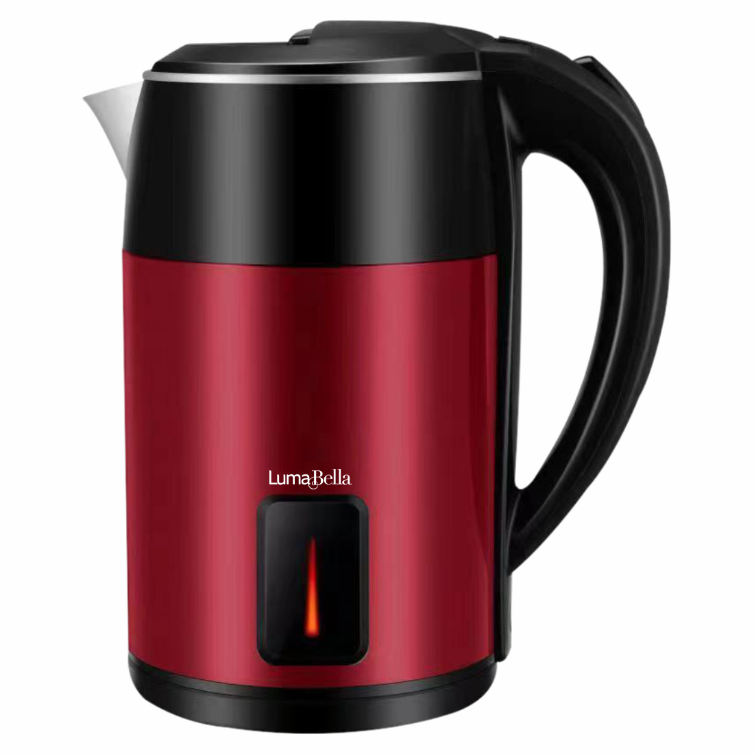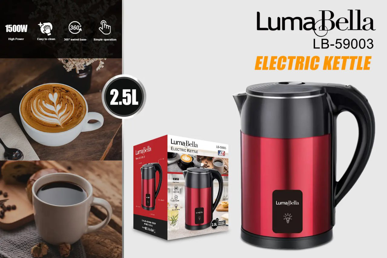 غلاية ماء بسعة 2.5 لتر فائقة الكبر، مثالية للعائلات الكبيرة والمكاتب. تصميم جذاب بلوني الأحمر والأسود العصري. غليان سريع وقاعدة دوارة 360 درجة. مزودة بخاصية الأمان (الإغلاق التلقائي).