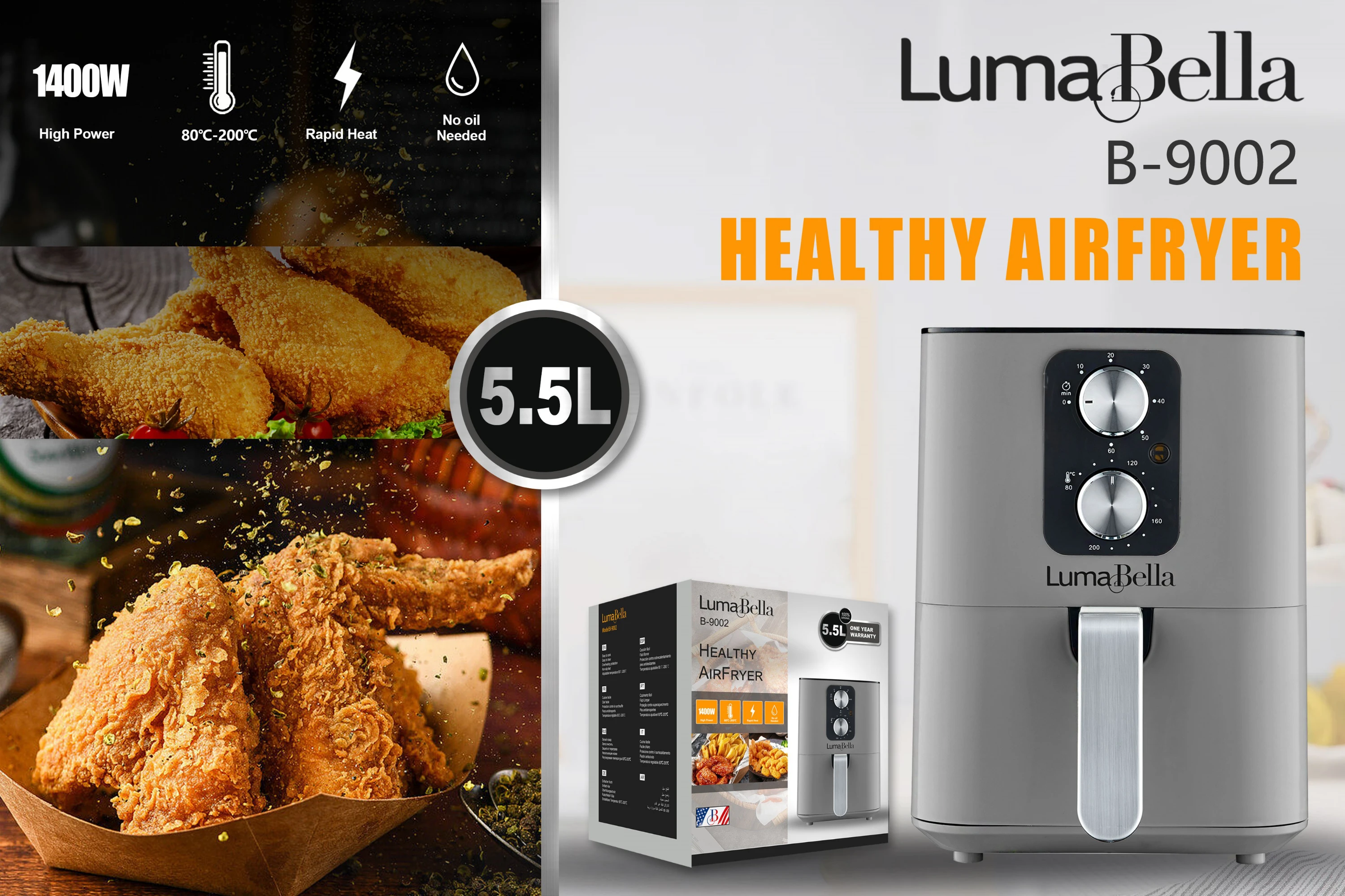 قلاية هوائية موثوقة بسعة 5.5 لتر، حجم عملي مثالي للأسر الصغيرة. تتميز بـ تحكم يدوي بسيط ومقبضين لضبط الوقت والحرارة. قوة 1400 واط لأداء جيد ونتائج قلي صحية وسريعة بـ 80% دهون أقل.