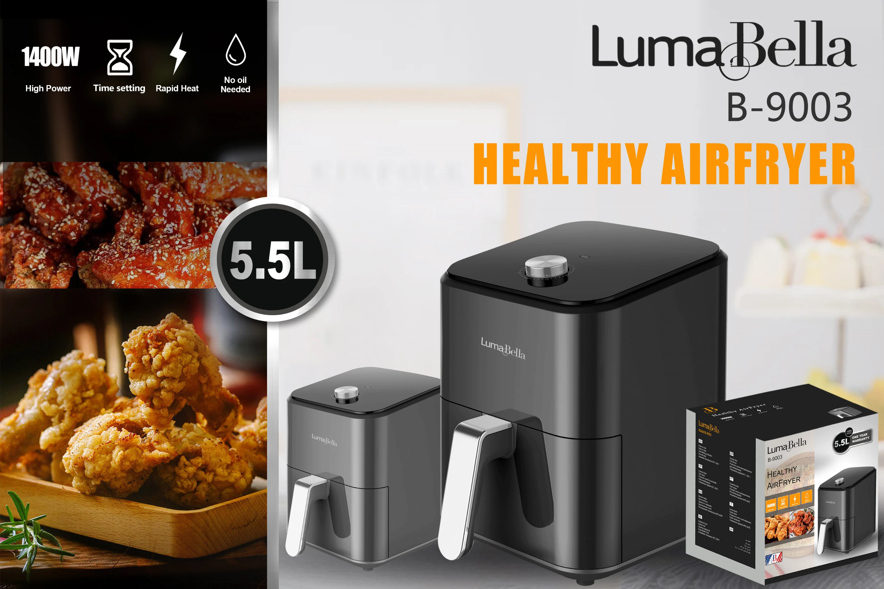 قلاية هوائية موثوقة بسعة 5.5 لتر، حجم عملي مثالي للأسر الصغيرة. تتميز بـ تحكم يدوي بسيط ومقبضين لضبط الوقت والحرارة. قوة 1400 واط لأداء جيد ونتائج قلي صحية وسريعة بـ 80% دهون أقل