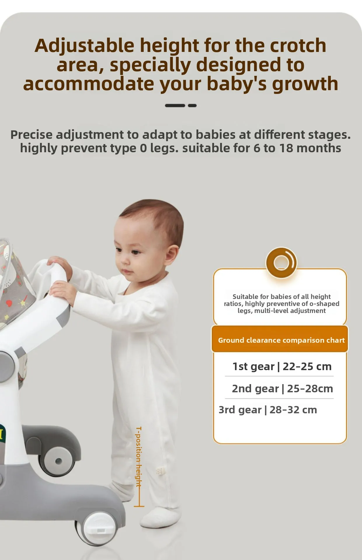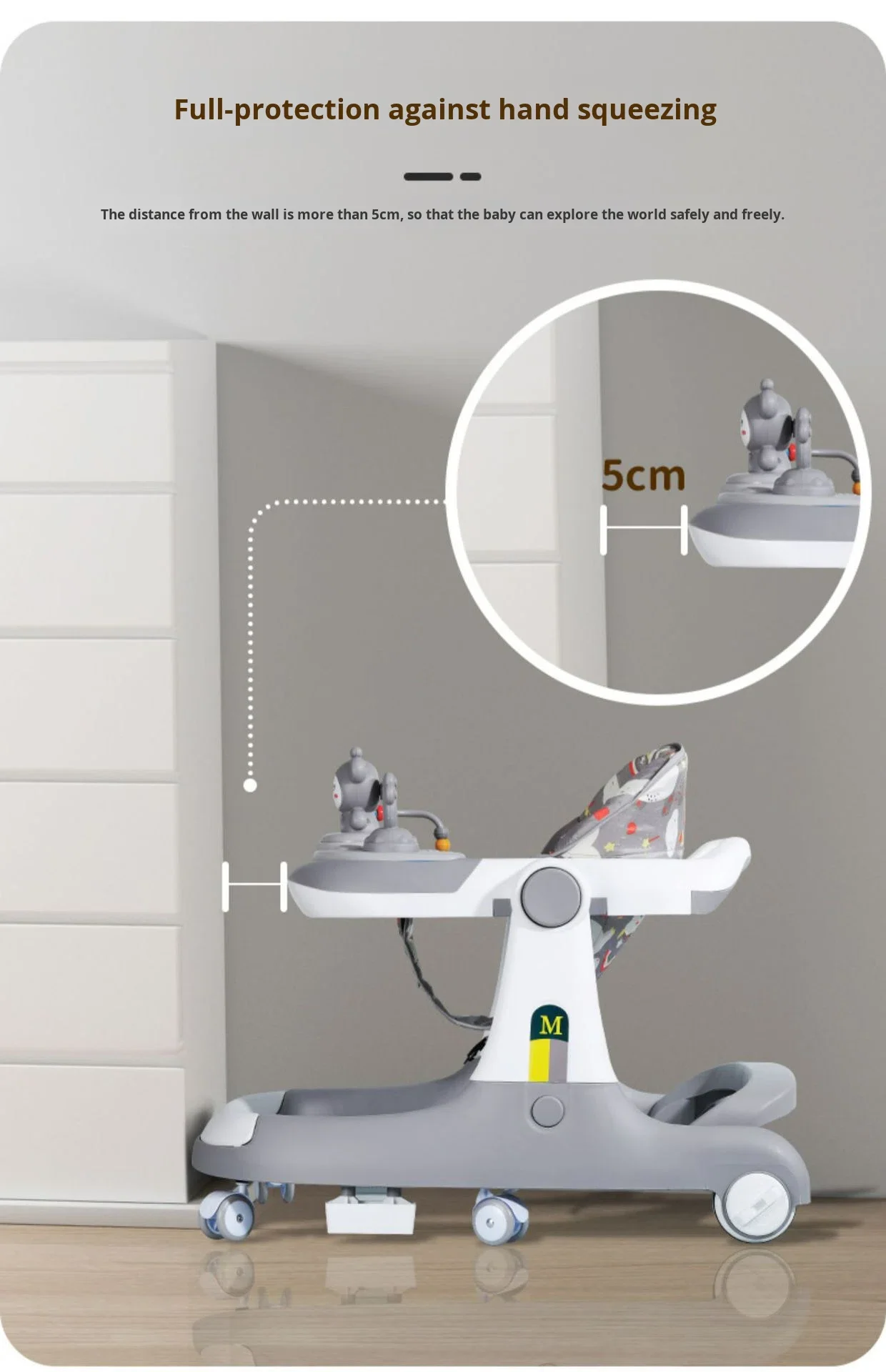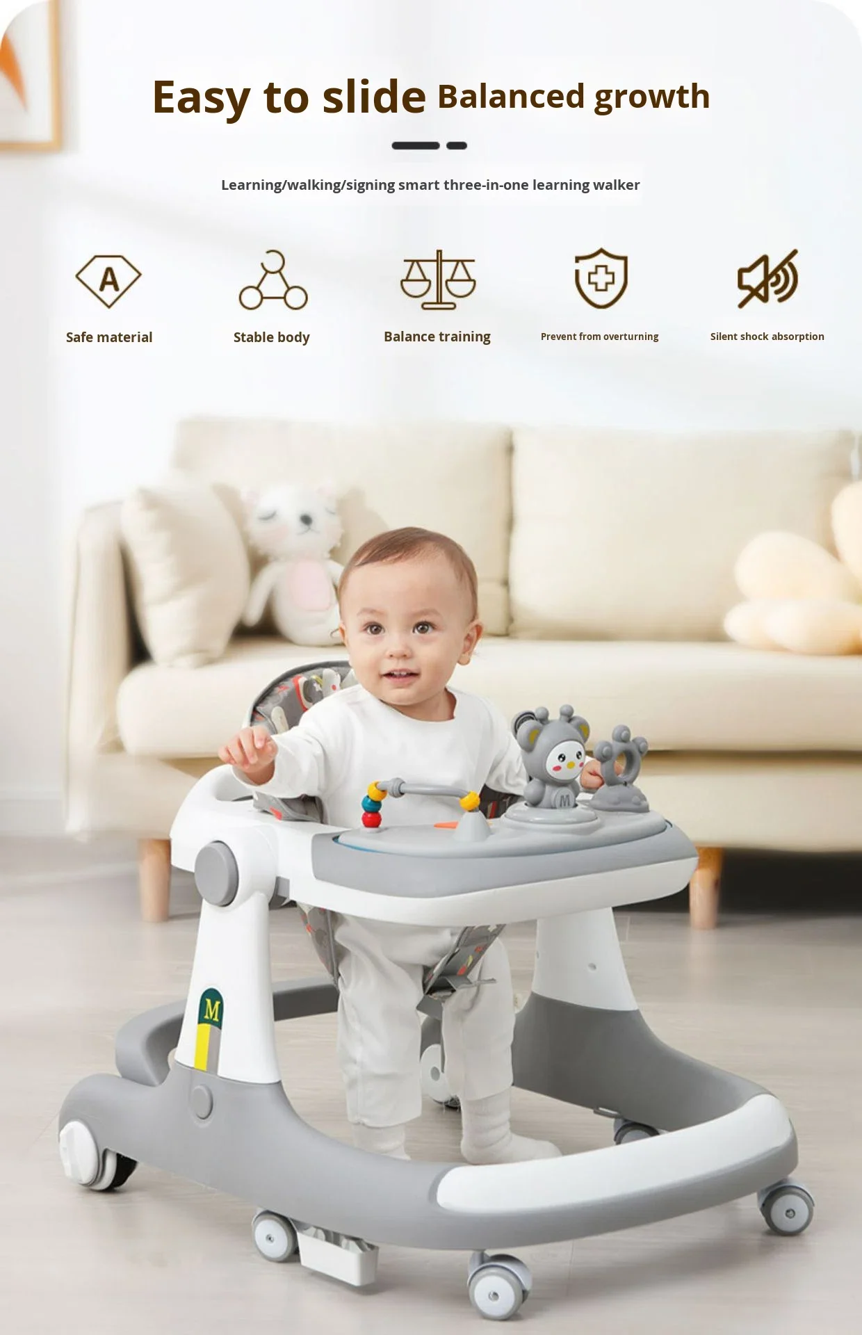 1. الأمان أولاً: تصميم مضاد للانقلاب:** تم تصميم هذه المشاية بعناية فائقة لضمان أقصى درجات الأمان. الهيكل العريض وقاعدة الثبات المتوازنة تجعلها مضادة للانقلاب تمامًا، مما يوفر راحة البال للآباء. كما أنها مصنوعة من بلاستيك آمن وعالي الجودة، بسعة تحمل تصل إلى 10 كجم. **2. حماية النمو الصحي للساقين:** على عكس المشايات التقليدية، تم تصميم هذه المشاية هندسياً لمساعدة الطفل على اتخاذ الخطوات بطريقة صحيحة ومستقيمة. هذا التصميم الفريد يمنع الضغط غير المتوازن على عظام الطفل، مما يساعد على منع تقوس الساقين وضمان نمو سليم. **3. مركز أنشطة وتعليم مبكر:** أكثر من مجرد مشاية! الجزء الأمامي مصمم على شكل سيارة جذابة ويحتوي على مجموعة من الألعاب والأنشطة التفاعلية التي تعمل على تطوير المهارات الحركية الدقيقة، وتعزيز التنسيق بين اليد والعين، وتحفيز التعلم المبكر. **4. عملية ومناسبة للجنسين:** تتميز بألوان محايدة (بناءً على افتراض اللون) وتصميم جذاب مناسب لكل من الأولاد والبنات. سهلة التنظيف والتحريك، وهي الإضافة المثالية لمرحلة استكشاف المشي.
