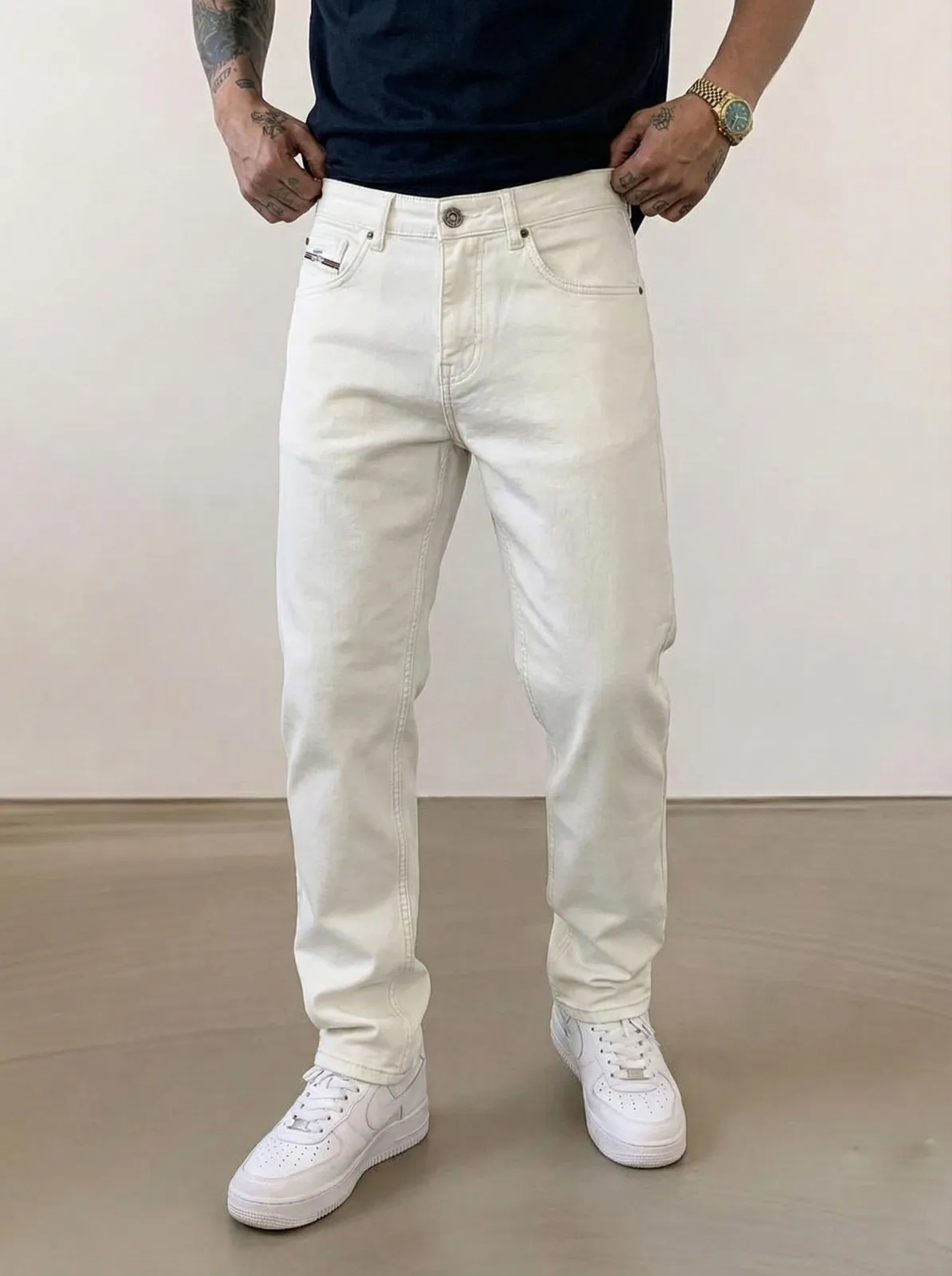 بنطلون جينز رجالي بلون أوف وايت عصري بقصة ستريت فيت مريحة، مصنوع من قطن مرن عالي الجودة يمنحك راحة طوال اليوم ومظهر كاجوال أنيق يناسب أجواء الخليج والمناسبات اليومية.