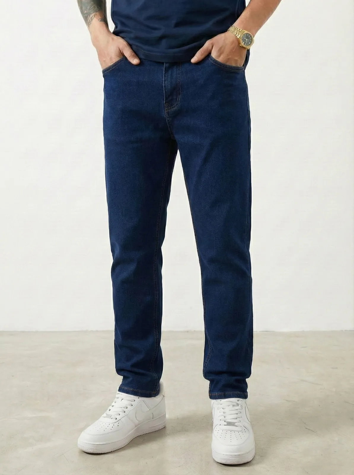 بنطلون جينز رجالي بلون أزرق داكن كلاسيكي بقصة ستريت فيت أنيقة، مصنوع من قطن مرن عالي الجودة يمنحك راحة وثبات طوال اليوم. مثالي للدوام، الخروجات، والإطلالات الكاجوال في أجواء الخليج.