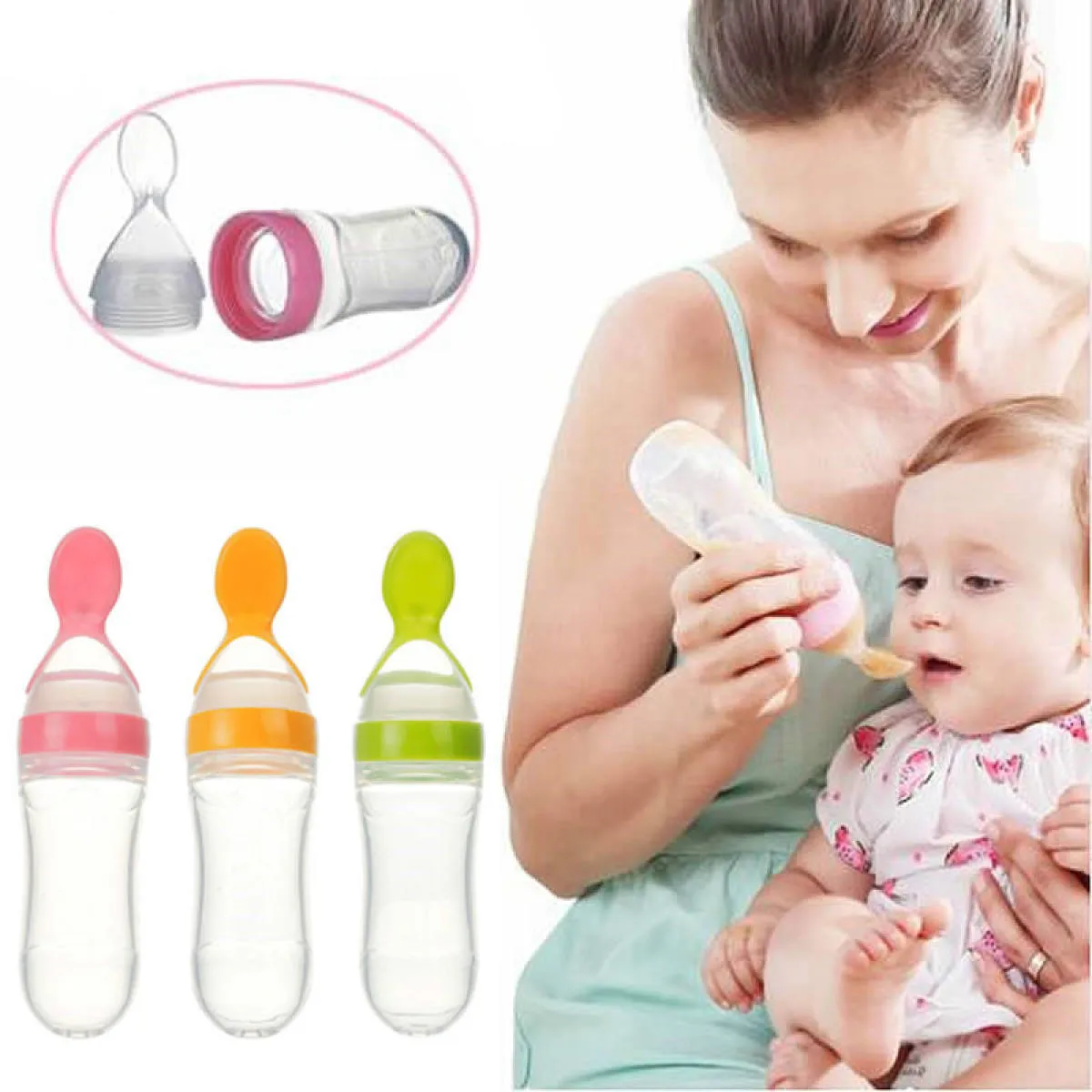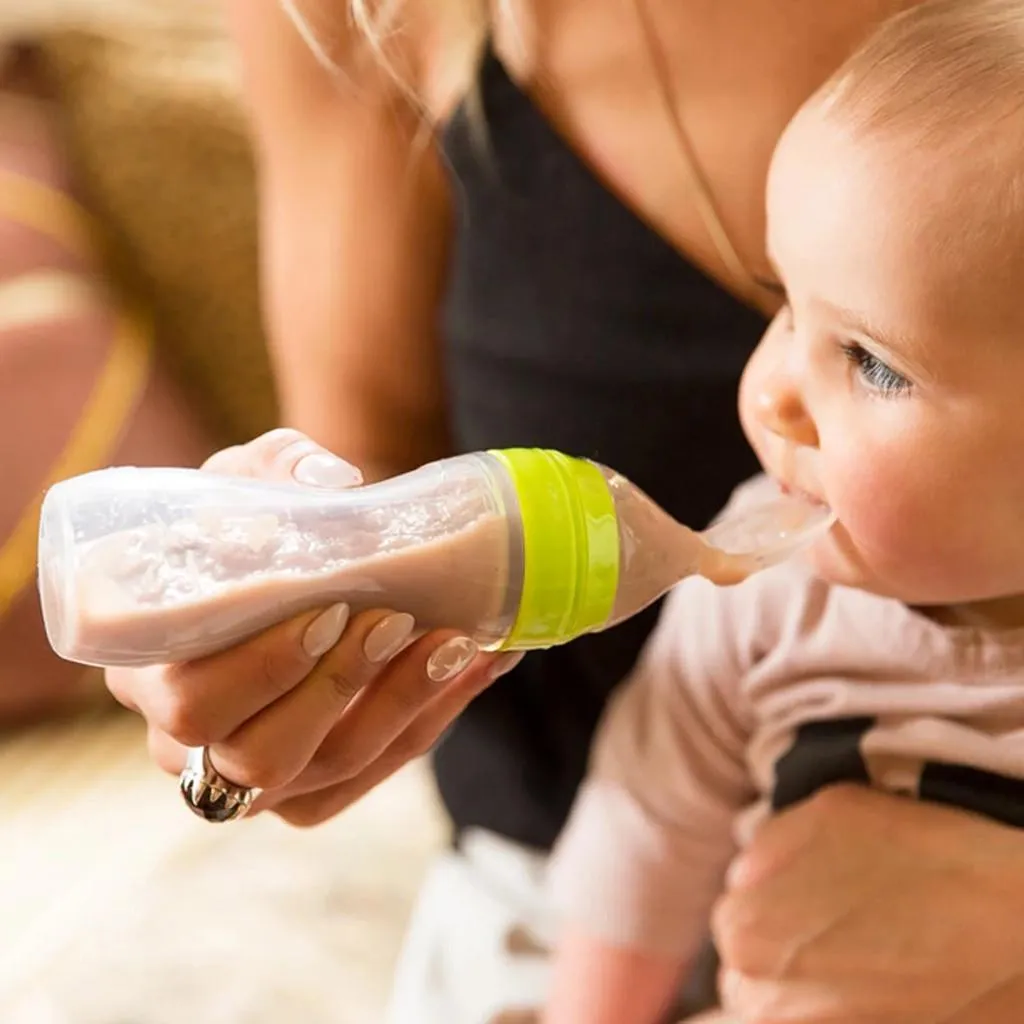 زجاجة رضاعة مبتكرة مصنوعة من السيليكون الآمن، مزودة بملعقة ناعمة في النهاية. مصممة لتقديم الأطعمة المهروسة، وحبوب الأرز، وشبه السائلة للرضع والأطفال الصغار بطريقة سهلة ومتحكم بها.