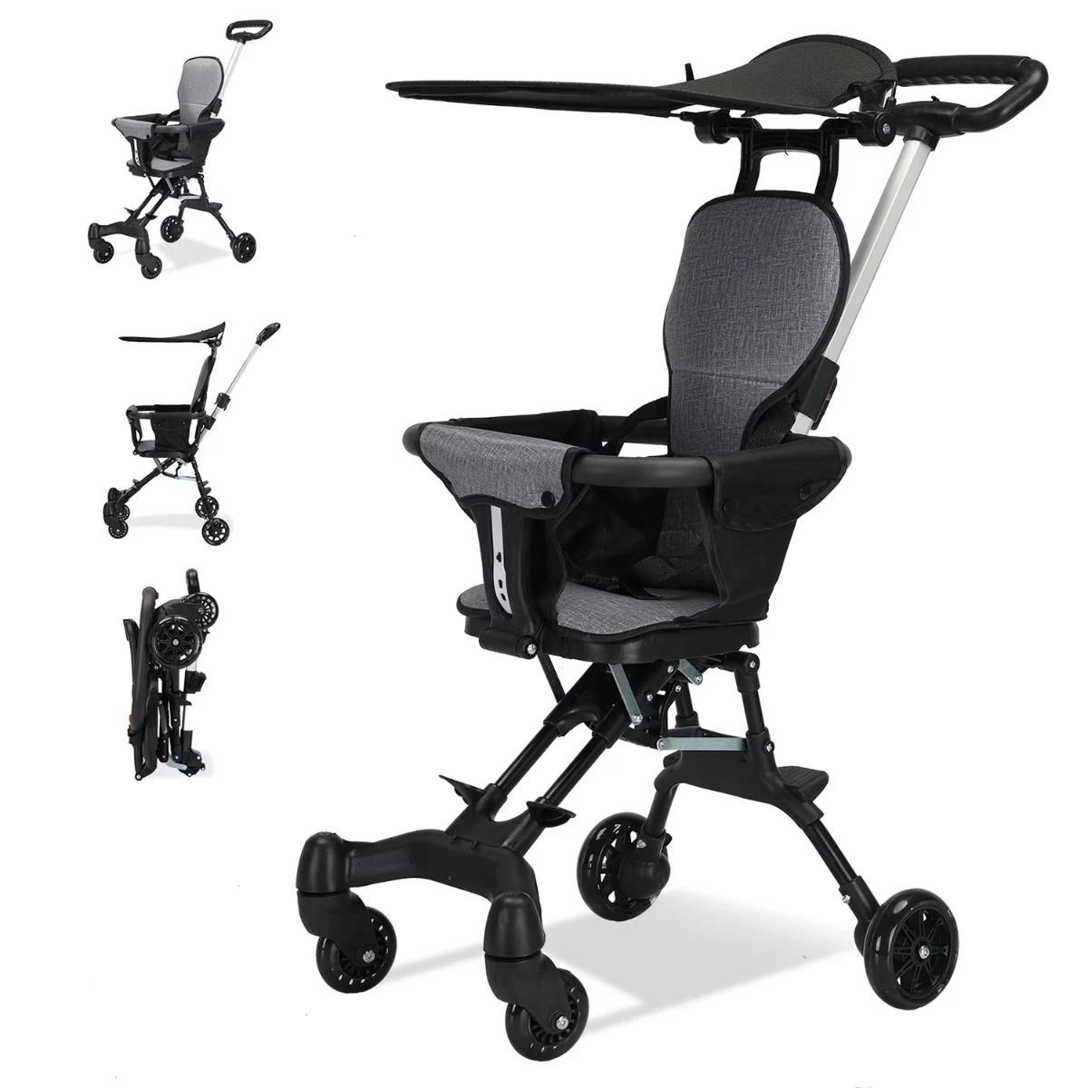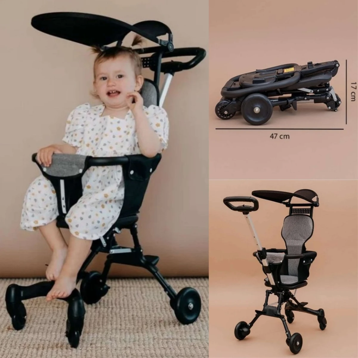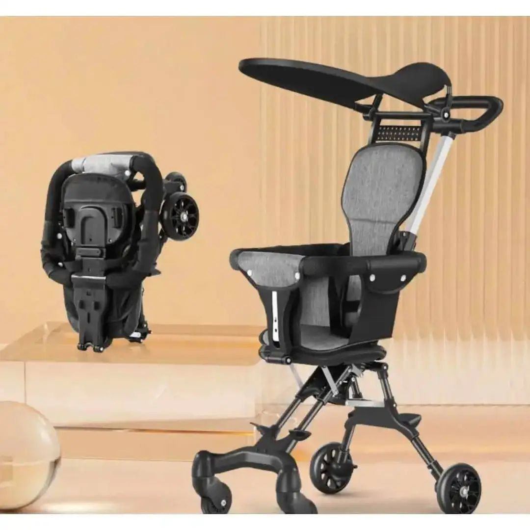 عربية أطفال عملية وخفيفة الوزن، بتتطوى بيد واحدة وسهلة الحمل في السفر أو الطيارة، تجمع بين الراحة والأمان بشكل عصري وأنيق.