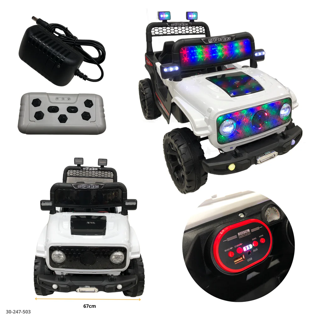 حوّل وقت لعب طفلك إلى مغامرة ملحمية مع سيارة الجيب الكهربائية البيضاء المذهلة هذه. تتميز بمجموعة رائعة من مصابيح LED، بما في ذلك شريط إضاءة مذهل وشبكة مضيئة، هذه السيارة التي تعمل بالبطارية 12 فولت تجلب الإثارة ليلاً أو نهارًا. تم تعزيز التصميم على الطرق الوعرة بعجلات متينة وهيكل قوي، مثالي للمغامرين الصغار. مع جهاز تحكم عن بعد لراحة بال الوالدين، تجمع سيارة الركوب هذه بين السلامة والأناقة. توفر قمرة القيادة الواسعة مقاعد مريحة، في حين أن التفاصيل الواقعية مثل واقي المصد الأمامي والأضواء المثبتة على السقف تجعلها خيارًا لا يقاوم للسائقين الصغار. يضيف مصباح LED المذهل لمسة سحرية إلى كل رحلة، بينما يضمن المحرك القوي 12 فولت التشغيل السلس. سواء كنت تتجول في الحديقة أو تتنقل في الأماكن الداخلية، فإن سيارة الجيب الكهربائية هذه توفر ساعات من الترفيه وتساعد على تطوير المهارات الحركية والوعي المكاني. المزيج المثالي من المرح والعملية يجعل سيارة الركوب هذه خيارًا ممتازًا لعشاق رياضة السيارات الصغار.