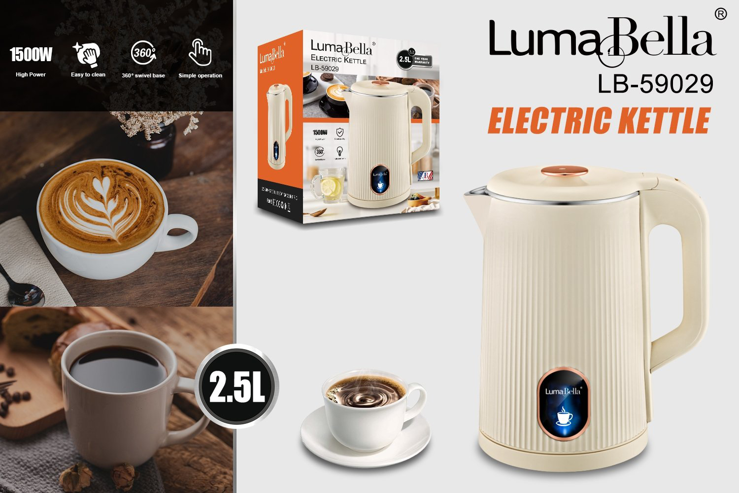 غلاية ماء بسعة 2.5 لتر ضخمة، مثالية للعائلات والمكاتب. تتميز بتصميم أبيض مُضلّع عصري يضيف لمسة من الأناقة النظيفة لمطبخك. غليان سريع وأمان مزدوج بفضل نظام الإغلاق التلقائي.