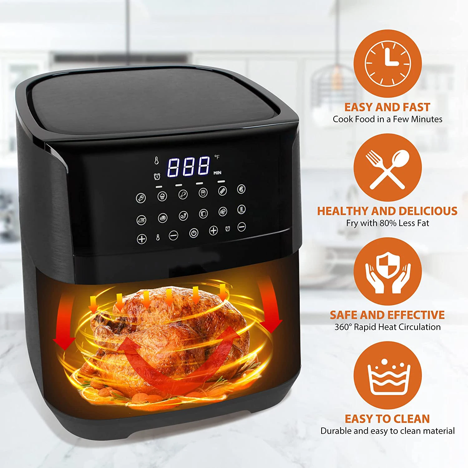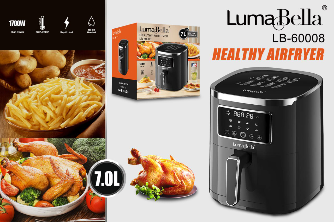 قلاية هوائية ديجيتال بسعة 7 لتر، مثالية للاستخدام اليومي. قوة 1700 واط لأداء فعال وسريع. تتميز بتحكم رقمي سهل وبرامج طهي مسبقة. استمتع بوجبات مقرمشة ولذيذة مع تقليل استهلاك الدهون بشكل كبير.
