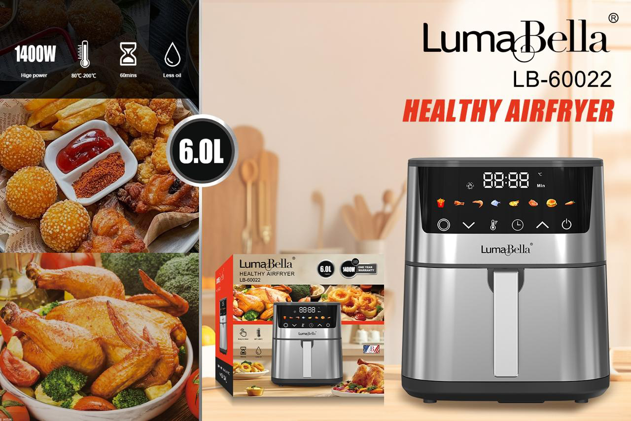 قلاية هوائية ديجيتال بسعة 6 لتر، مثالية للأسر الصغيرة ومحبي الأناقة. تصميم من الستانلس ستيل وقوة 1400 واط تضمن طهياً صحياً وسريعاً. تحكم رقمي سهل الاستخدام وميزات طهي مبرمجة مسبقاً.