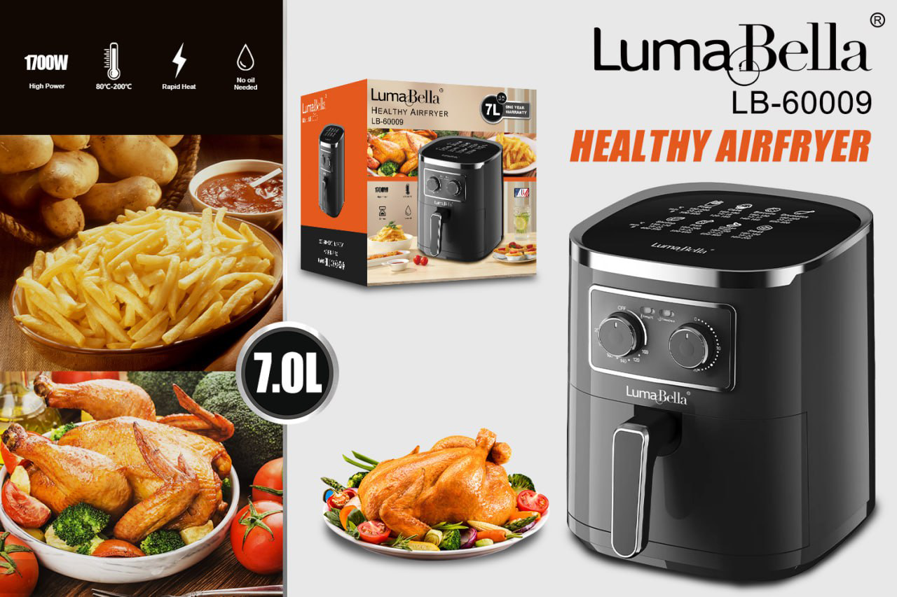 قلاية هوائية موثوقة بسعة 7 لتر، مثالية للأسرة الكبيرة. تتميز بـ تحكم يدوي (ميكانيكي) بسيط، وقوة 1700 واط لنتائج قلي صحية وسريعة. تصميم عملي، مع مقبض للوقت ودرجة الحرارة.