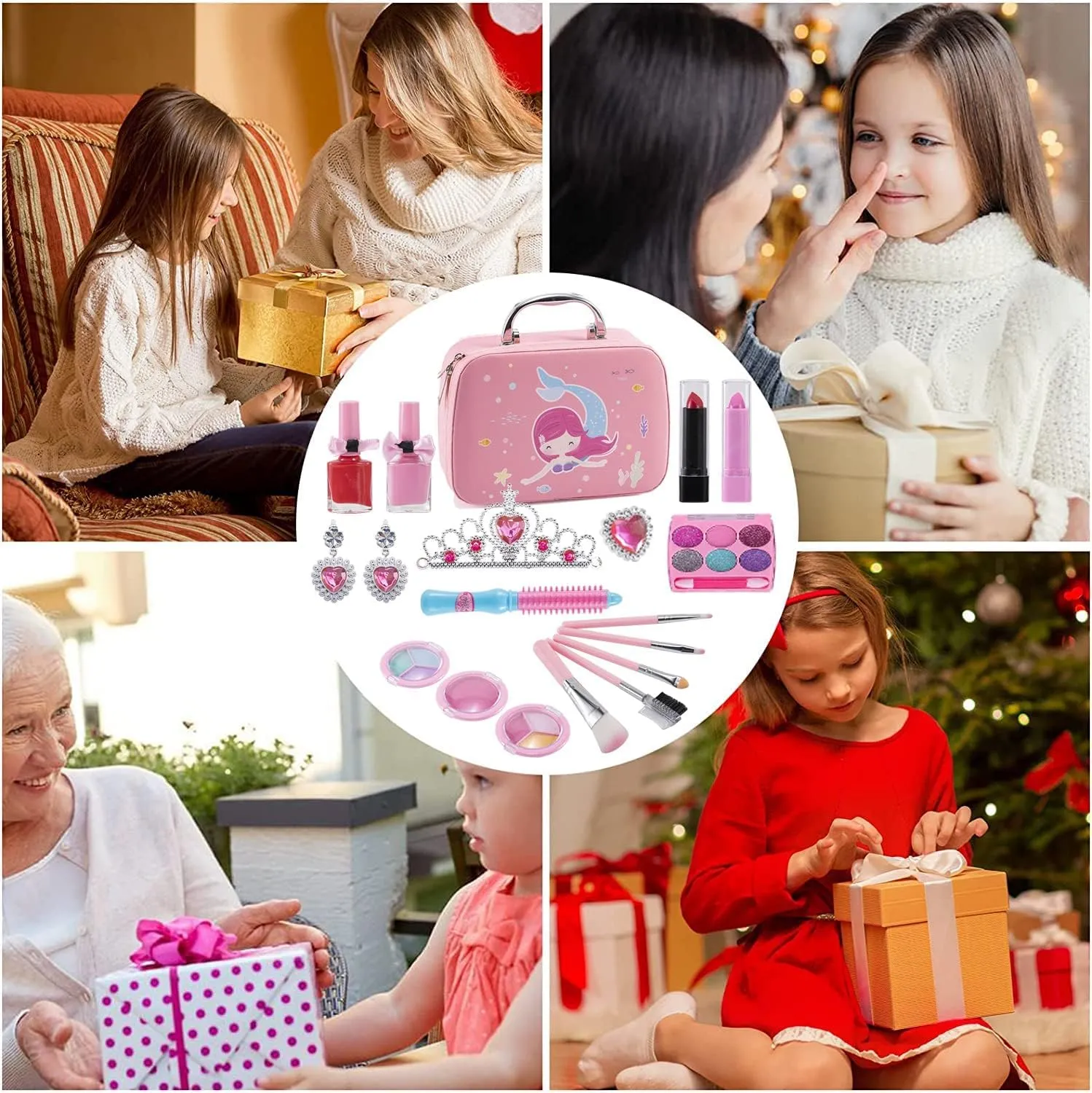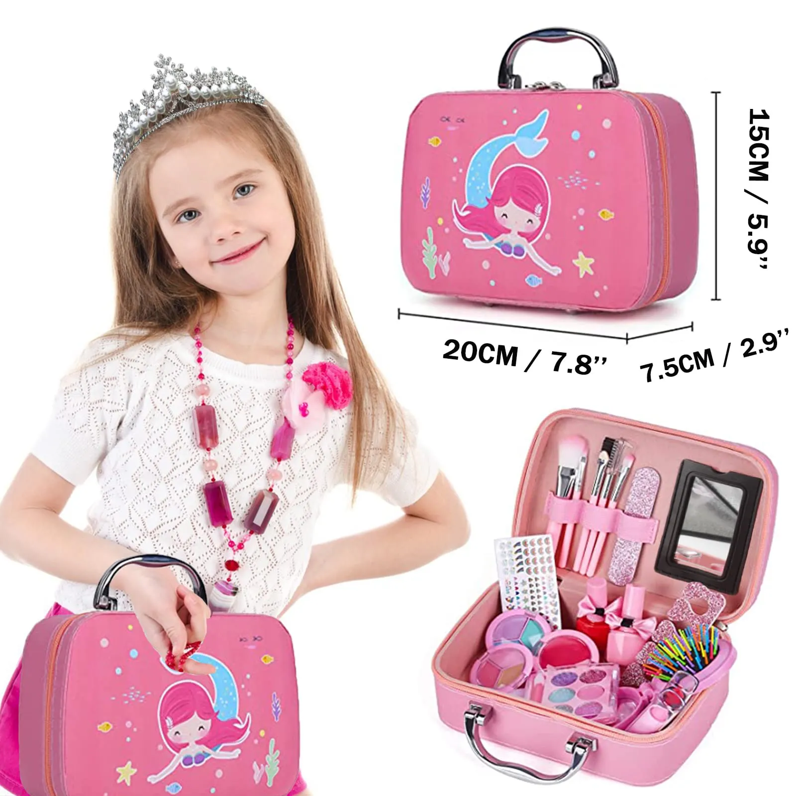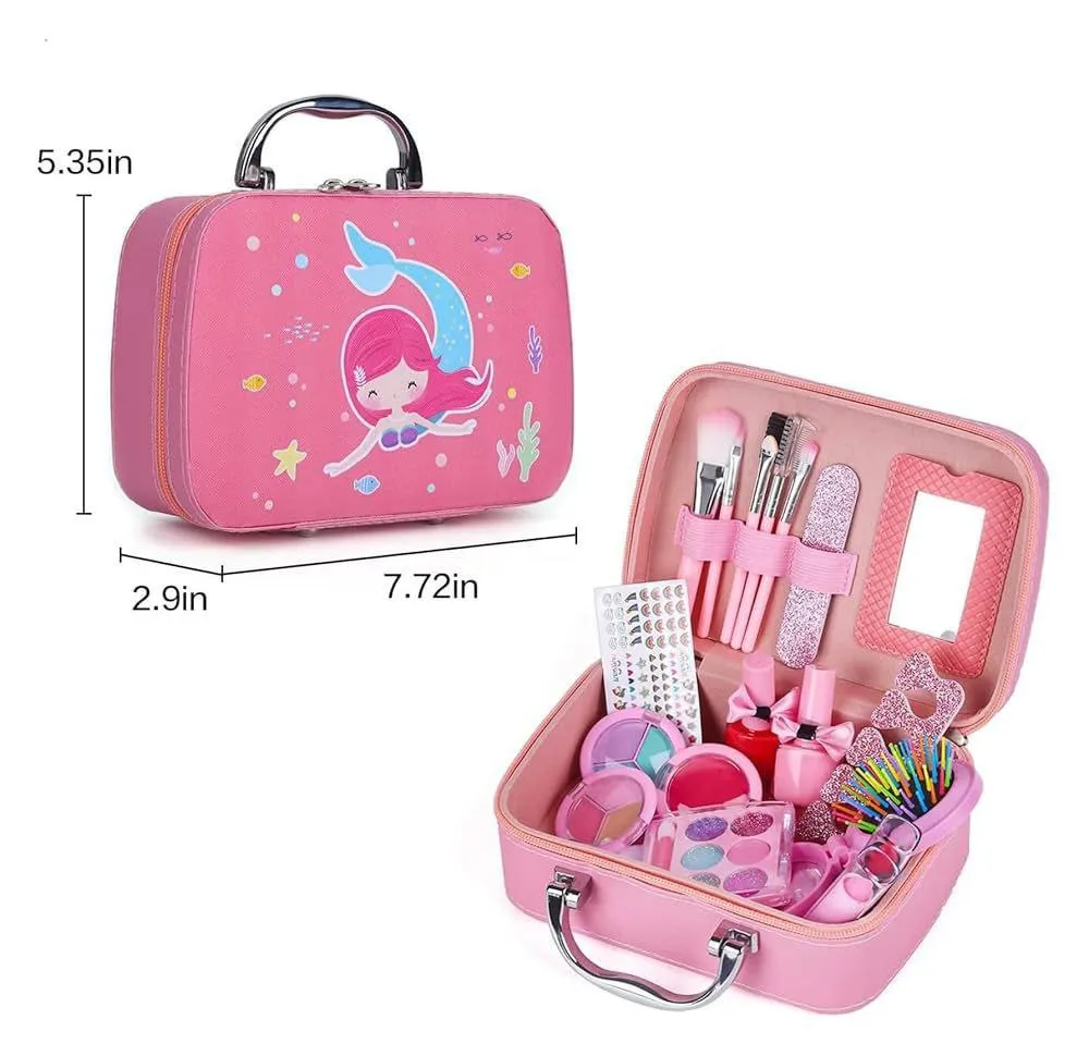 شنطة مكياج أنيقة بخامة عالية وتصميم ميرميد ساحر، تحتوي على مجموعة كاملة من المكياج الحقيقي والآمن للبشرة، بالإضافة إلى أدوات التجميل اللازمة مثل الفُرش والمرايا.