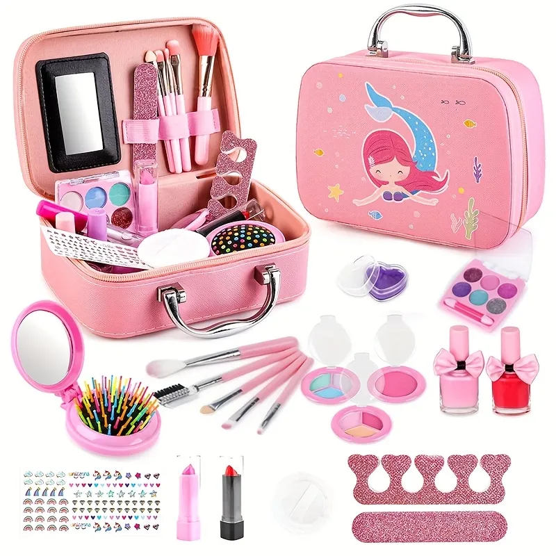 شنطة ميك أب ميرميد هي الهدية المثالية للأميرات الصغيرات اللواتي يعشقن عالم حوريات البحر والموضة. تأتي الشنطة بتصميم شيك وتقيل، مصنوعة من خامة عالية الجودة لضمان المتانة. الشنطة متقسمة من الداخل بشكل عملي وتحتوي على مراية مدمجة. محتويات الشنطة تشمل: ميك أب حقيقي مصنوع من خامات آمنة على بشرة الأطفال، 5 فرش ميك أب أساسية، فرشة شعر، و سفنجة للباودر. أما الألوان، فتضم 3 علب آيشادو بألوان خلابة، بلاشر، باودر، و جليتر لامع. لا تكتمل الإطلالة بدون الشفاه والأظافر؛ حيث تحتوي على 3 ألوان روج (أحدهم بتصميم قلب فريد)، 2 لون مانيكير (طلاء أظافر)، رسومات للأظافر، و مبرد لتهذيب الأظافر. مجموعة متكاملة للعب التخيلي وتنمية الذوق.