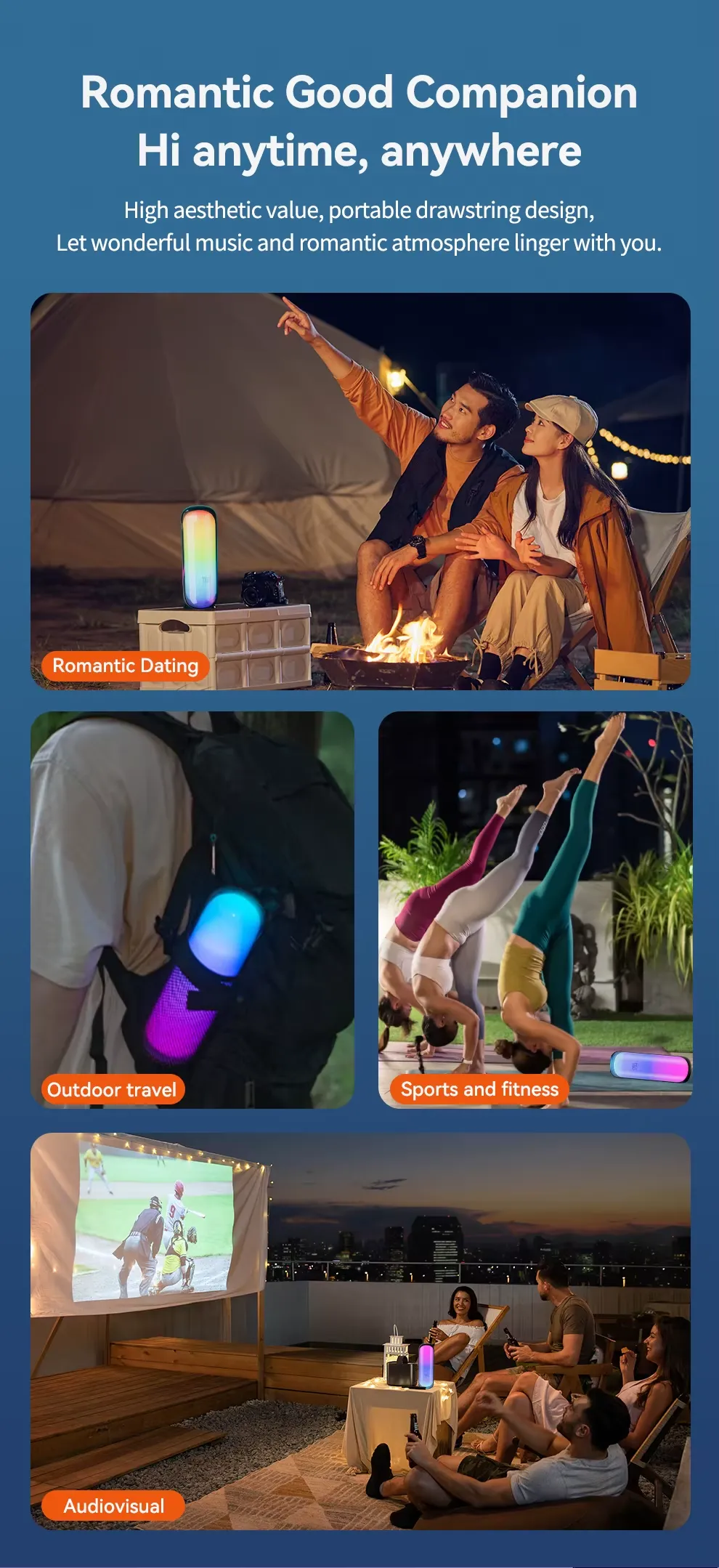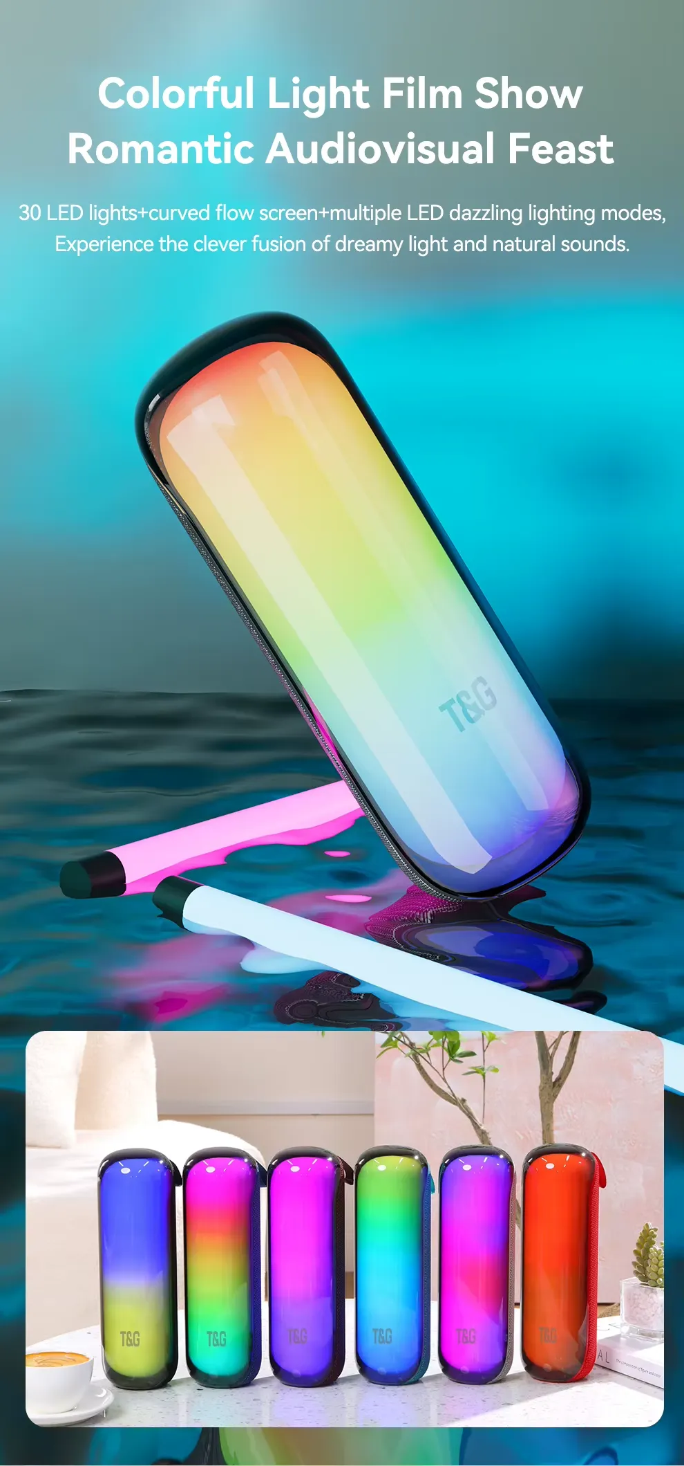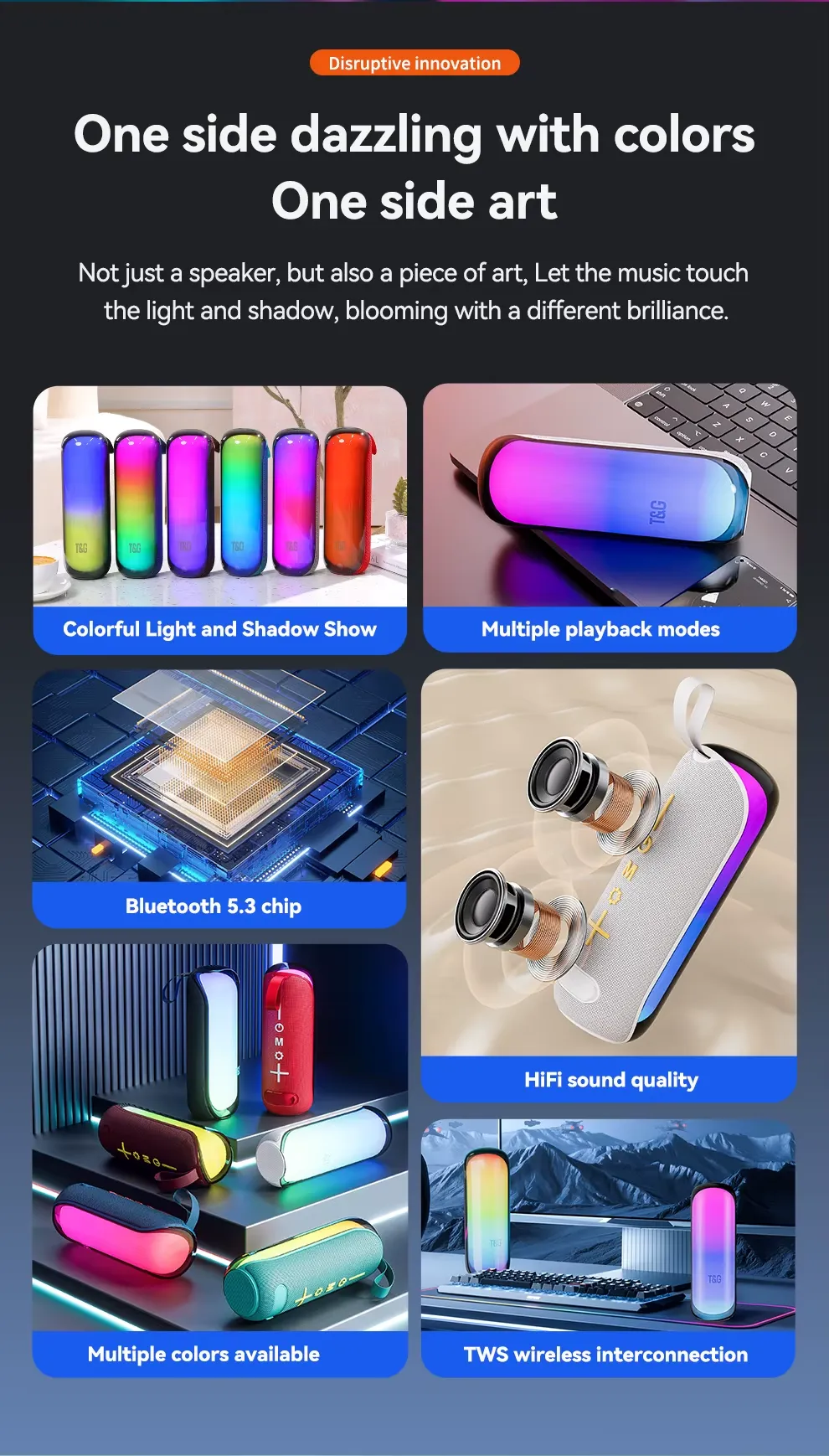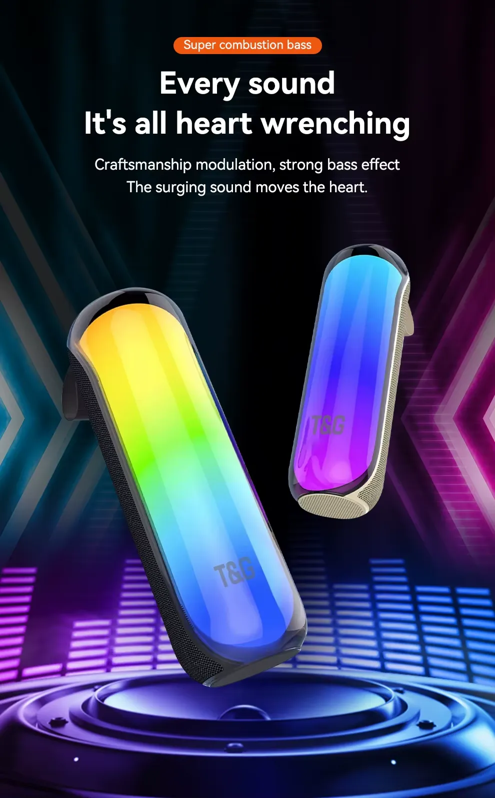 إضاءة فائقة التألق بـ 9 ألوان RGB مجموعة متنوعة من مصابيح LED الوامضة بألوان متنوعة، تومض الأضواء الملونة مع اللحن. مع وظيفة FM، يمكن البحث عن محطات الراديو تلقائيًا. سلسلة TWS تقنية اتصال TWS متقدمة، اتصال بين سماعتين. وظائف التحدث الحر في الوضع اللاسلكي مع اقتران الهاتف المحمول، عند ورود مكالمة، اضغط زر قصير للرد على المكالمة بدون استخدام اليدين، ثم اضغط مرة أخرى لرفع سماعة الرأس، ثم اضغط مرتين لمعاودة الاتصال. دعم بطاقات Micro SD وUSB. دعم ملفات الموسيقى MP3 وWMA. مع مدخل AUX. توصيل الأجهزة الخارجية مباشرةً، مثل الكمبيوتر اللوحي/التلفزيون/الهواتف المحمولة.