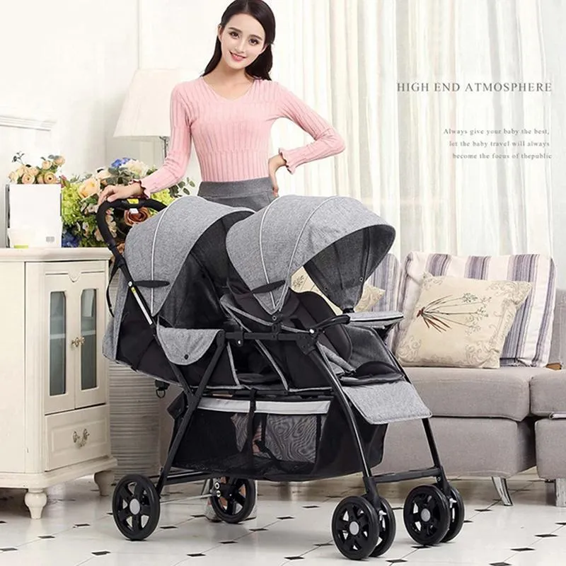 عربة توأم عملية ومريحة، مصممة لحمل طفلين معًا بسهولة وأمان أثناء التنقل.