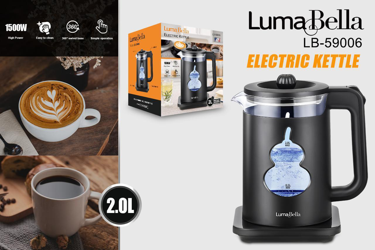غلاية ماء عصرية بسعة 2 لتر، مثالية للاستخدام المنزلي والمكتبي. تتميز بهيكل من الزجاج المقاوم للحرارة واللون الأسود الفاخر، مع إضاءة LED زرقاء داخلية أثناء التشغيل. قاعدة دوران 360 درجة وغليان سريع.