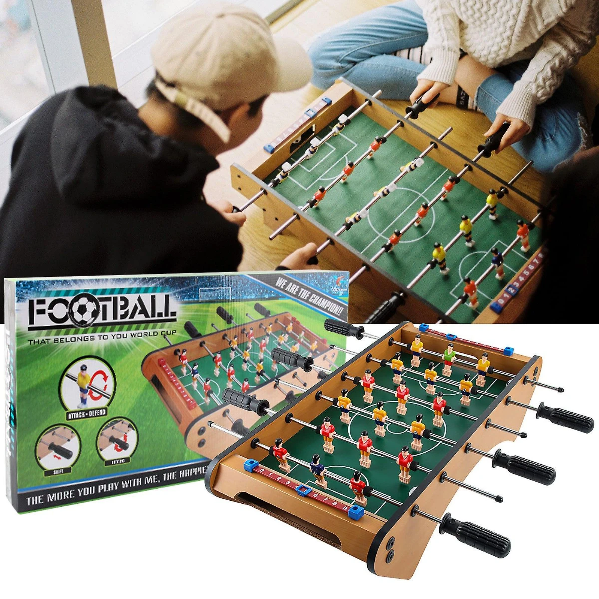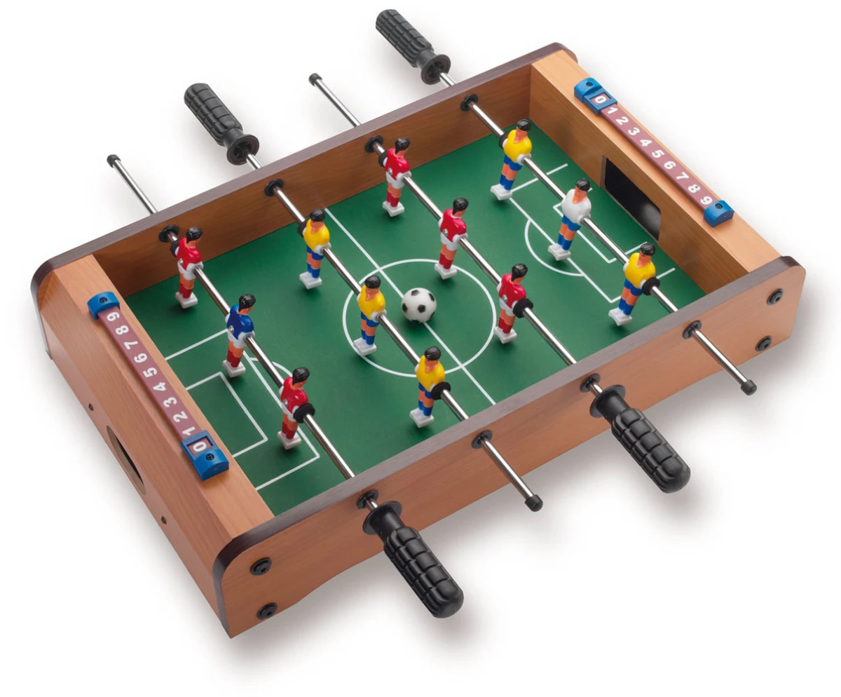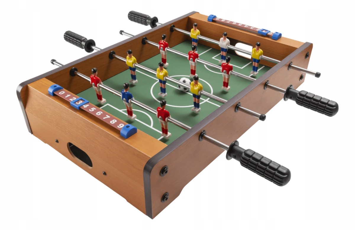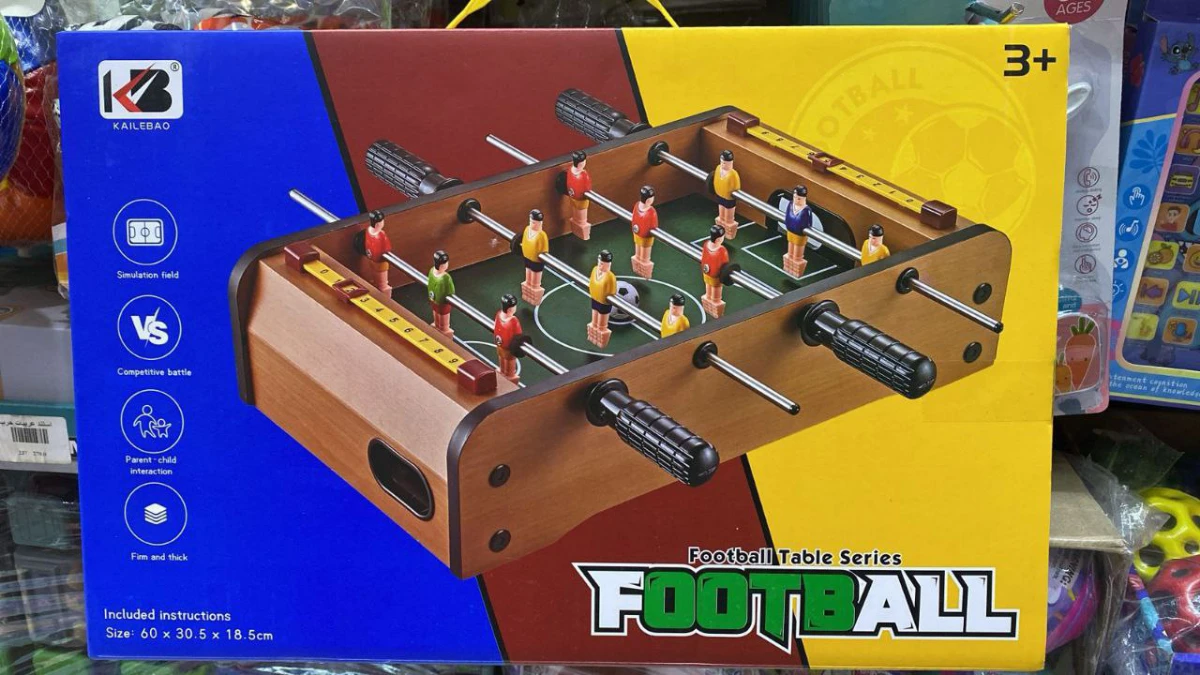 ✨ المميزات:✔️ ملعب خشبي متين بتصميم احترافي ومقابض متينة للتحكم الكامل✔️ فريقين بألوان مختلفة + عداد أهداف لكل لاعب 🔢✔️ تحكم بالمقابض لتوجيه اللاعبين وسرعة التمريرات والتسديد 🥅✔️ تساعد على تنمية التركيز والتنسيق بين العين والإيد 👀✋✔️ مناسبة للكبار والصغار — متعة جماعية مضمونة 😍✔️ خفيفة وسهلة التخزين — مثالية لأي مساحة في البيت أو المكتب