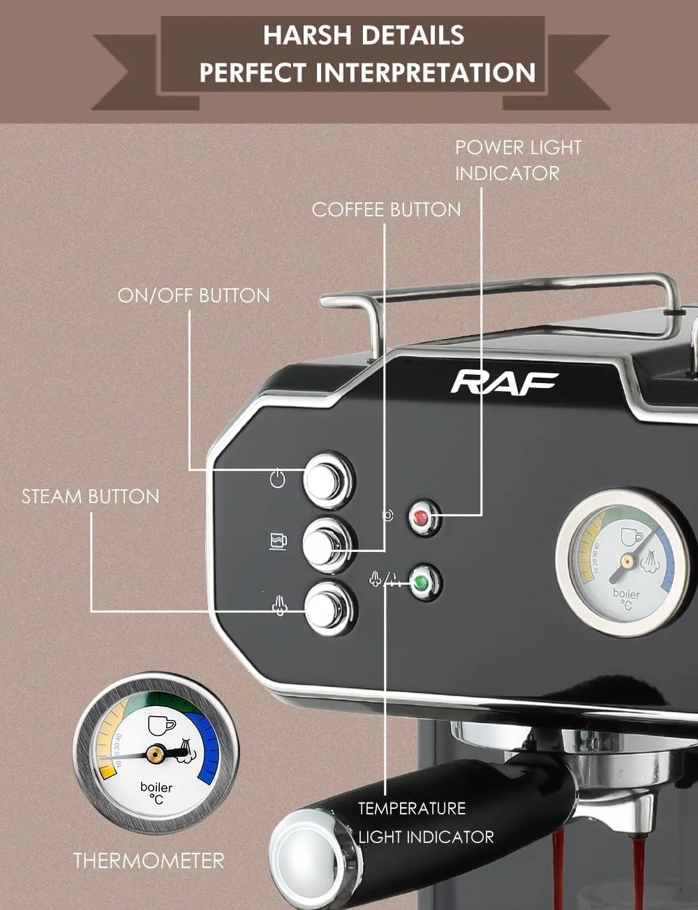 استمتع بتجربة قهوة احترافية في المنزل مع ماكينة R.104 من راف، قوة 850 وات وتصميم ستانلس ستيل أنيق يمنحك مذاق الإسبريسو الغني والرغوة المثالية كل صباح.