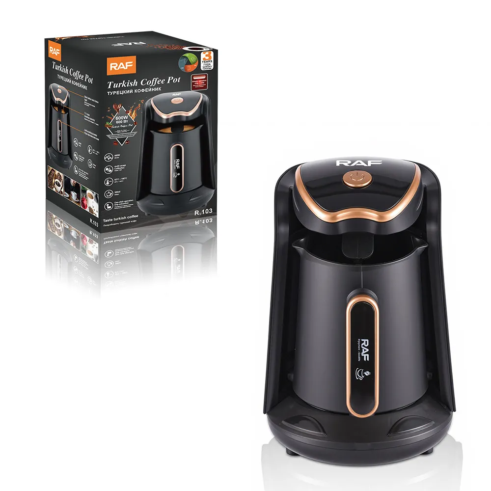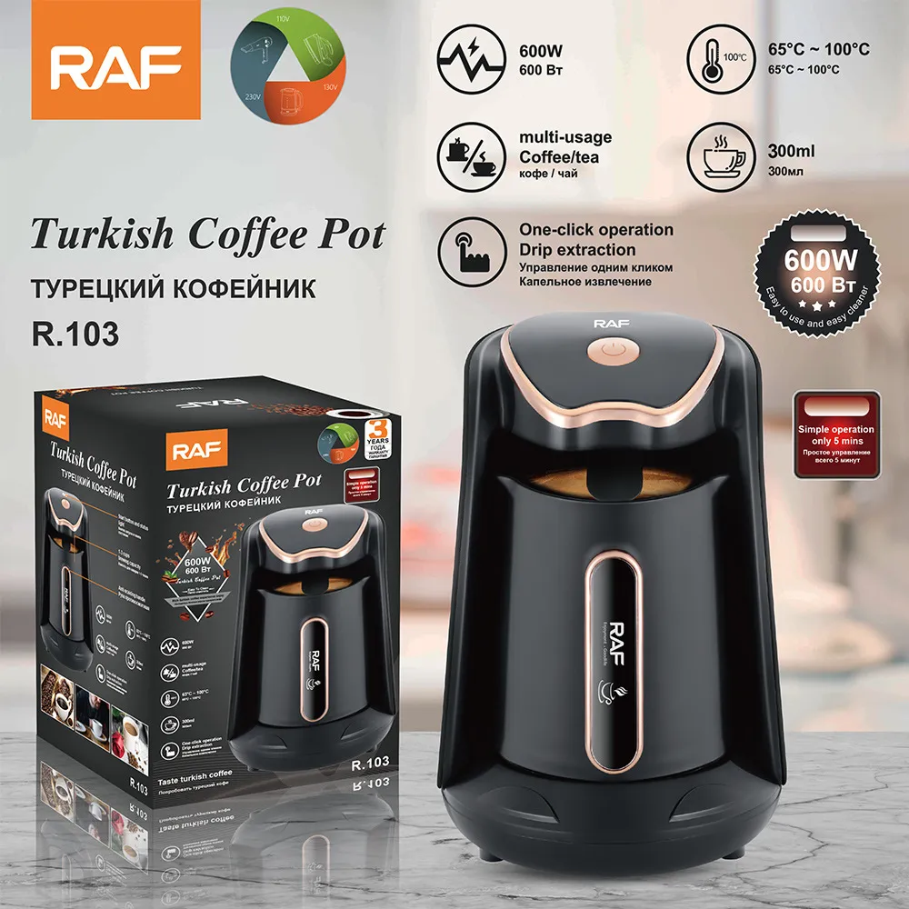 ماكينة صنع القهوة التركية بسعة 300 مل تعادل 4 أكواب، تعمل بقوة 600 وات لتحضير القهوة بسرعة مع نكهة أصلية تقليدية.تتميز بنظام مانع الفوران الذكي الذي يمنع سكب القهوة خارج الإبريق ويحافظ على نظافة مكان التحضير.تصميم مريح سهل الاستخدام، مع مؤشر ضوئي للتشغيل ومقبض معزول للحرارة لضمان الراحة والأمان أثناء الاستخدام.مثالية للاستعمال المنزلي والمكتب والهدية، وتمنحك قهوة تركية غنية بالرغوة وبمذاق مميز في دقائق.