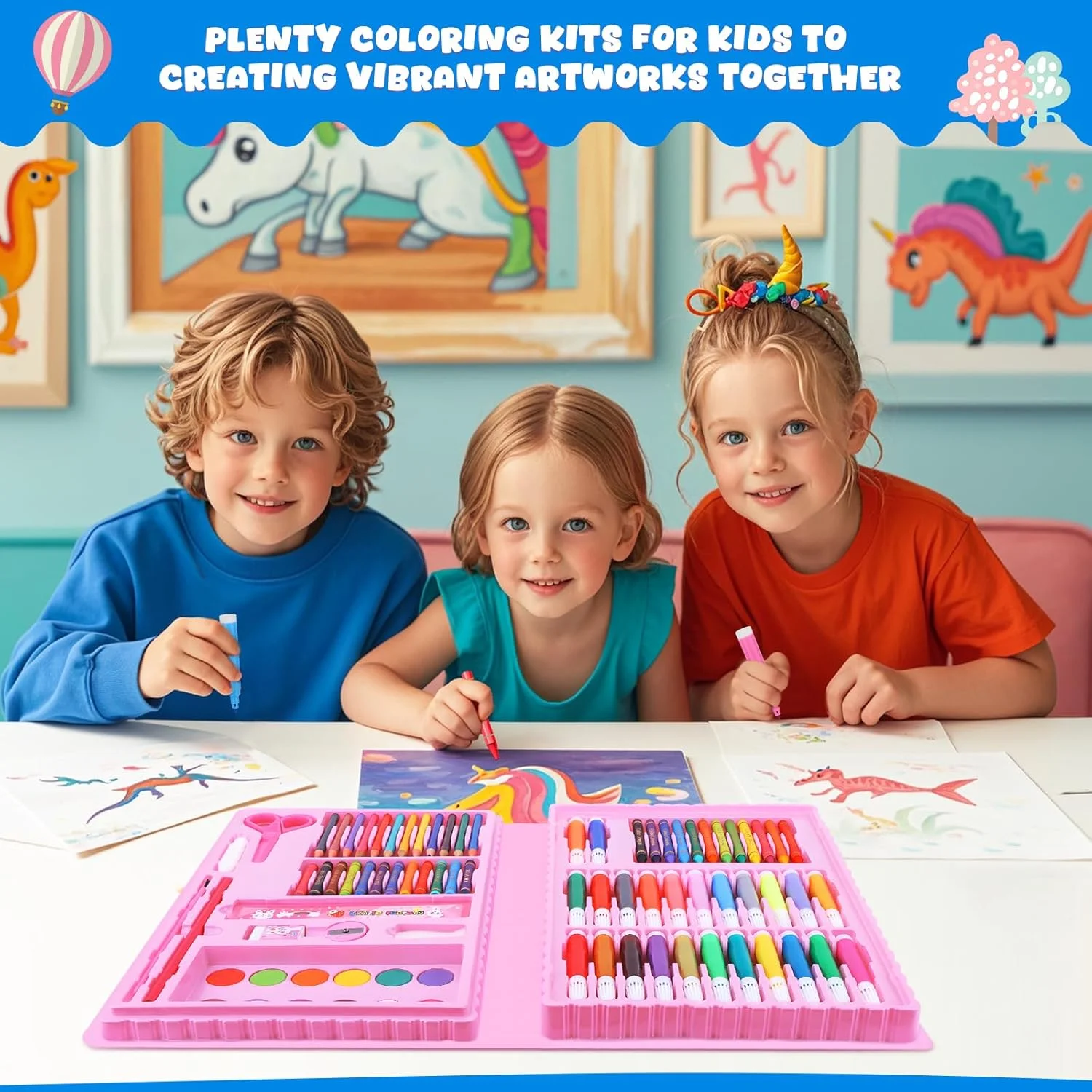 مجموعة فنية متكاملة ومثالية للأطفال، تحتوي على أقلام تلوين، وأقلام تحديد (ماركر)، وكعكات مائية، ودفتر رسم، وقوالب (استنسل)، لتشجيع الإبداع واللعب الحرفي لدى الأولاد والبنات.
