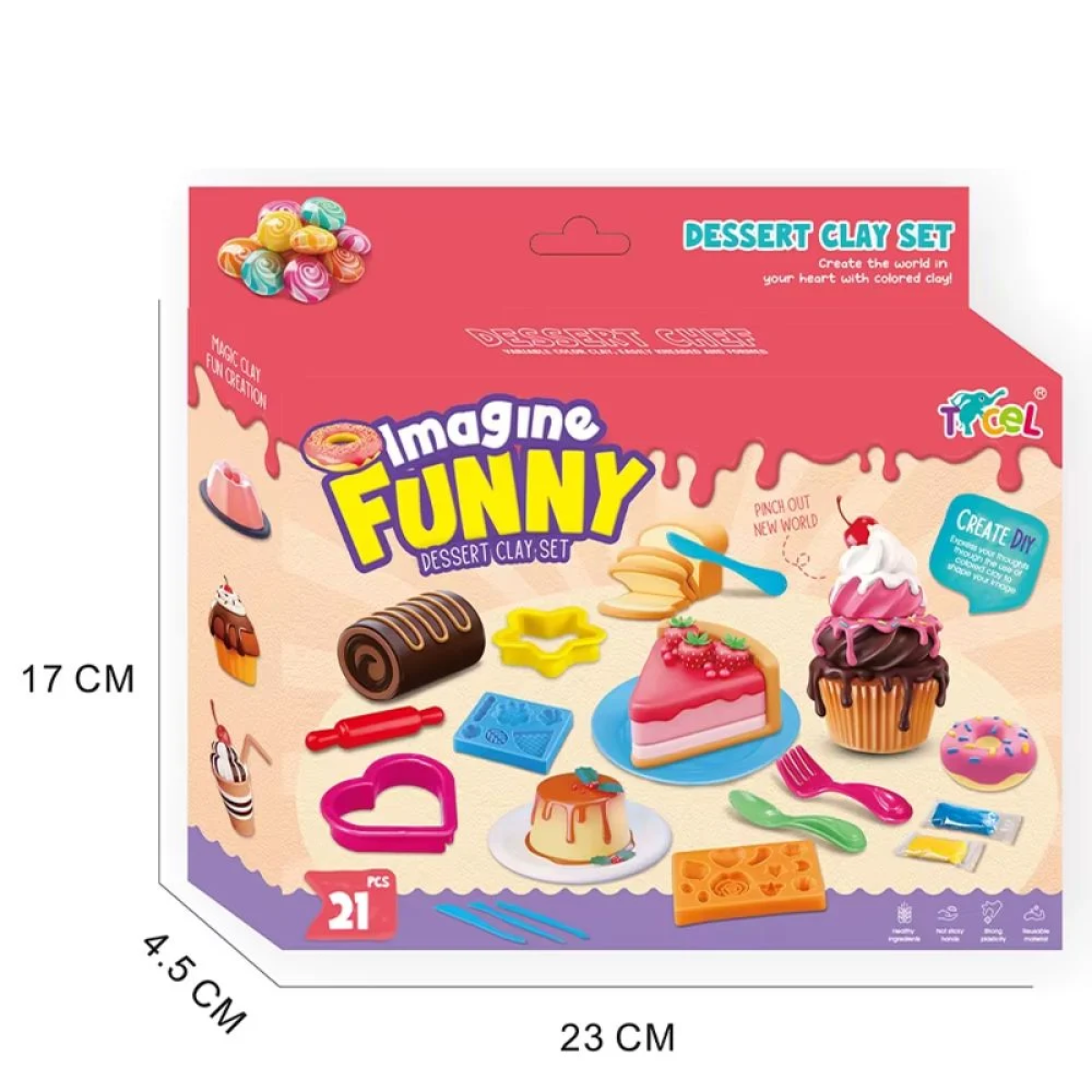 مجموعة إبداعية متكاملة من صلصال اللعب، تحتوي على 21 قطعة تشمل قوالب وأدوات مخصصة لصنع أشكال حلوى مضحكة وملونة. مثالية لتنمية الخيال والمهارات الحركية للأطفال من سن 3 سنوات فما فوق.