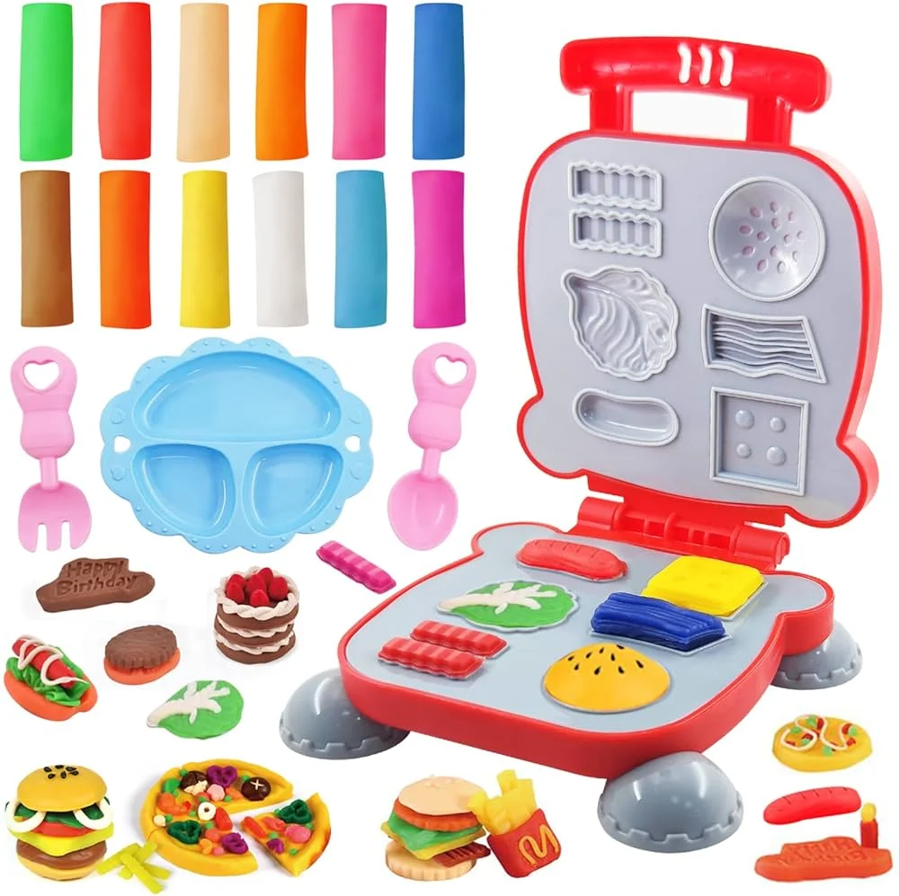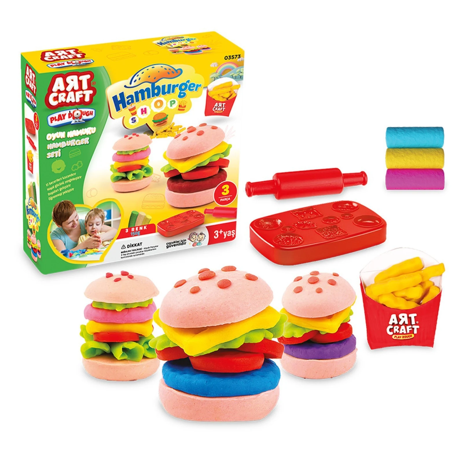مجموعة عجين لعب مبتكرة مكونة من 4 قطع وقوالب، تتيح للطفل صنع سندويشات الهامبرغر وأشكال طعام أخرى، مما يساهم بشكل كبير في تطوير مهاراته الحركية وخياله الإبداعي.