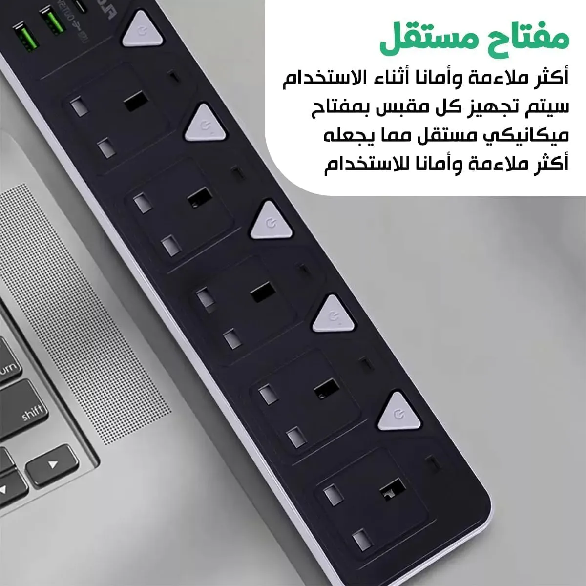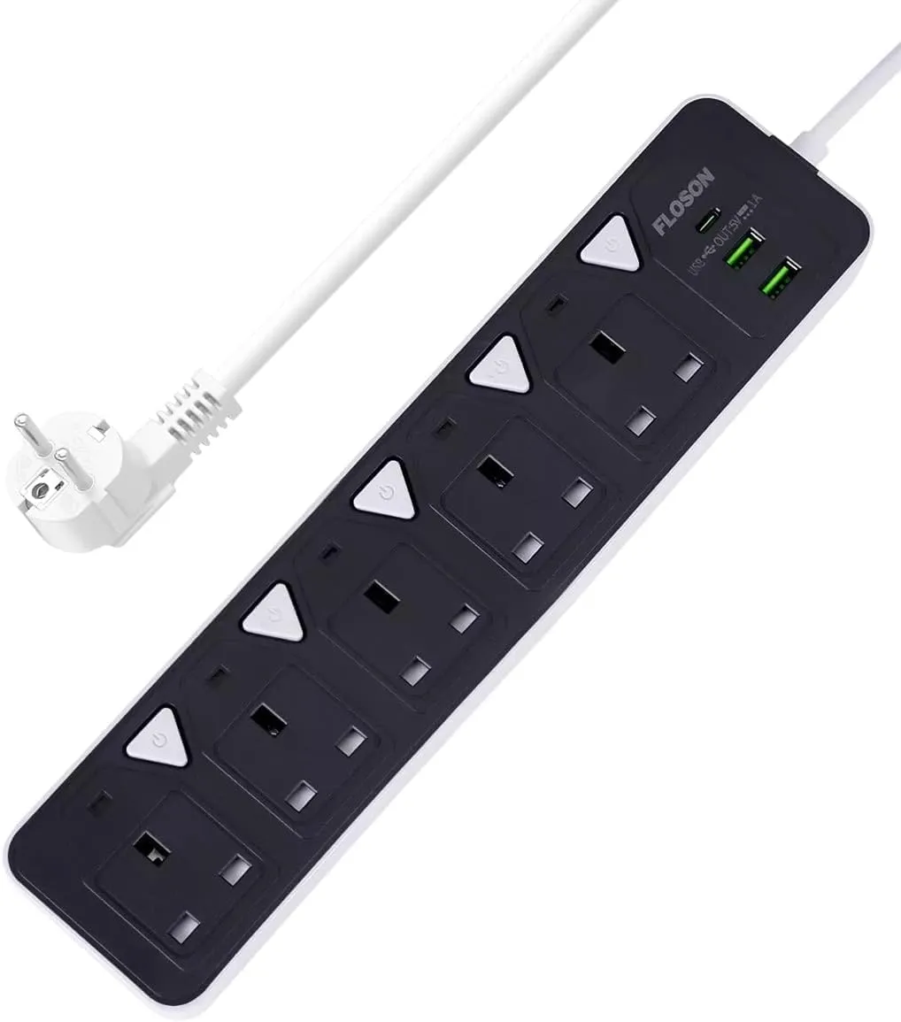 مشترك كهربائي متعدد الاستخدامات مع مداخل USB وUSB-C و5 مقابس تيار، يوفر أمانًا عاليًا وحماية من الحمل الزائد، مناسب للمنازل والمكاتب.