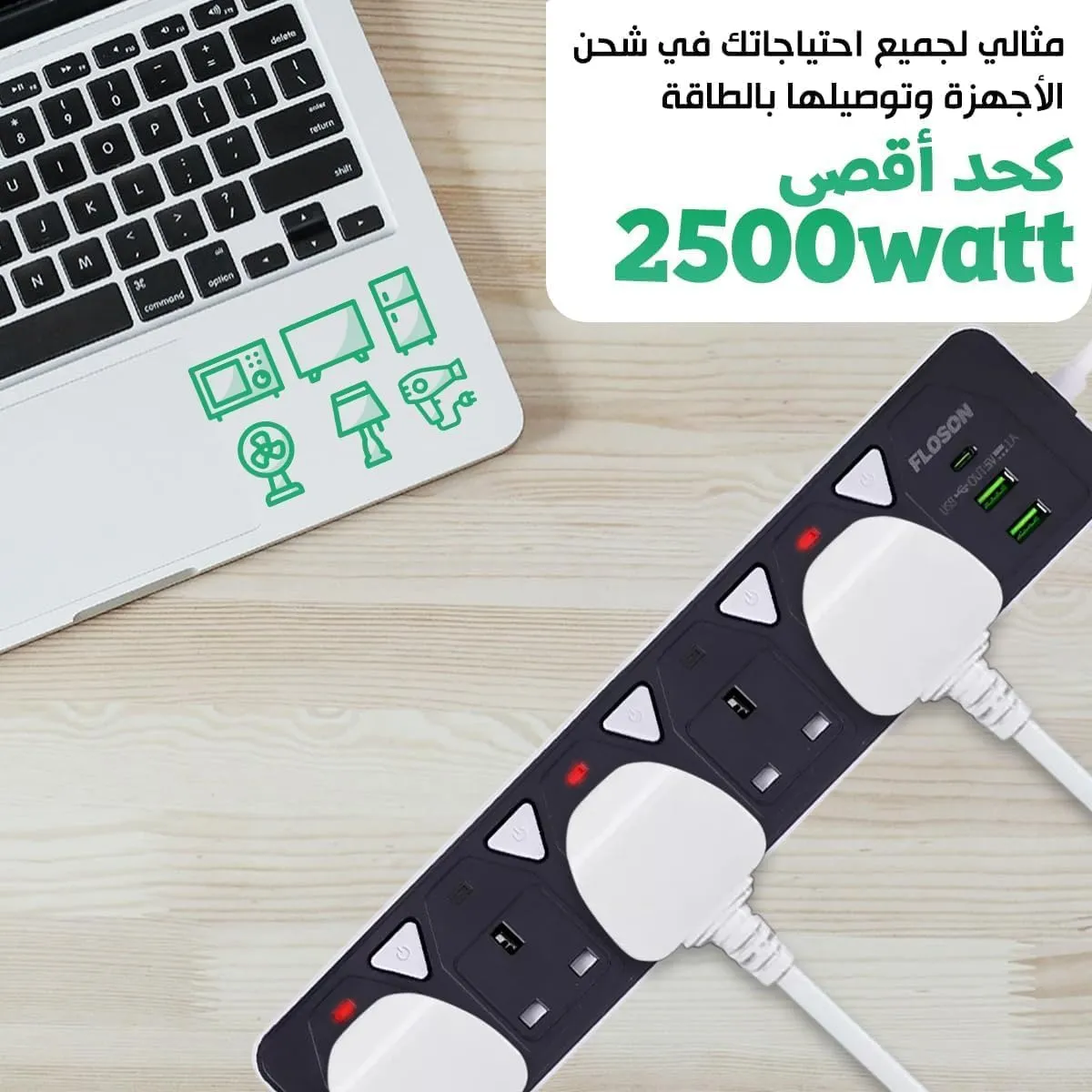 مشترك كهرباء عالي الجودة مصمم لتوفير توزيع طاقة آمن وسهل. يحتوي على 5 مقابس AC ومنفذ USB-A ومنفذ USB-C للشحن السريع، مما يجعله مناسبًا للشواحن، الكمبيوتر المحمول، الهواتف الذكية، الأجهزة المنزلية، وأدوات المكتب.مزود بخاصية الحماية من الحمل الزائد وقفل أمان للأطفال لمنع إدخال الأشياء المعدنية داخل الفتحات.يأتي بسلك تمديد مقاوم مع عزل آمن ويضمن توزيعًا مناسبًا للطاقة بحد أقصى 2500 وات. طول 3 متر